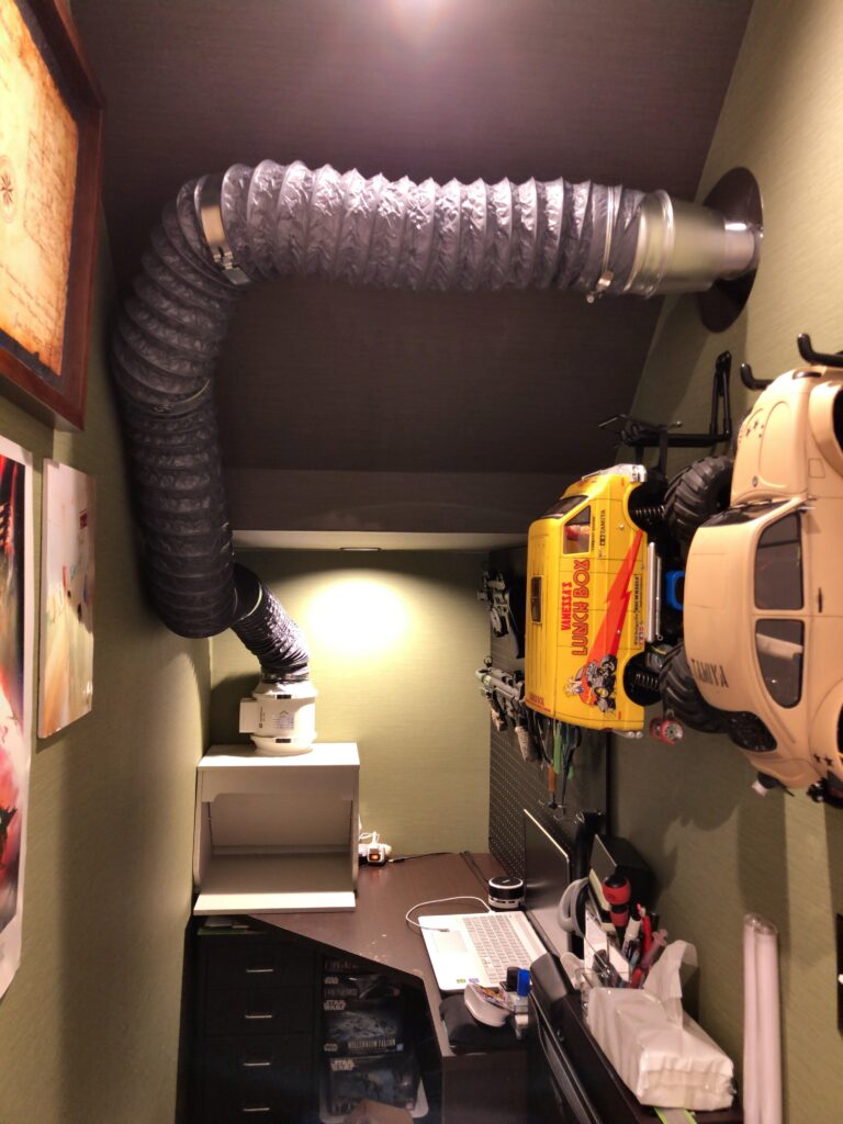 いずれ作り方を紹介しますが、自作の塗装ブースを置いて、この中でプラモデルの塗装とか、工作をしています。