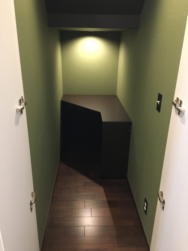外から見るとこんな感じで、入り口は、秘密部屋っぽく観音開きのクローゼット用のドアにしています。